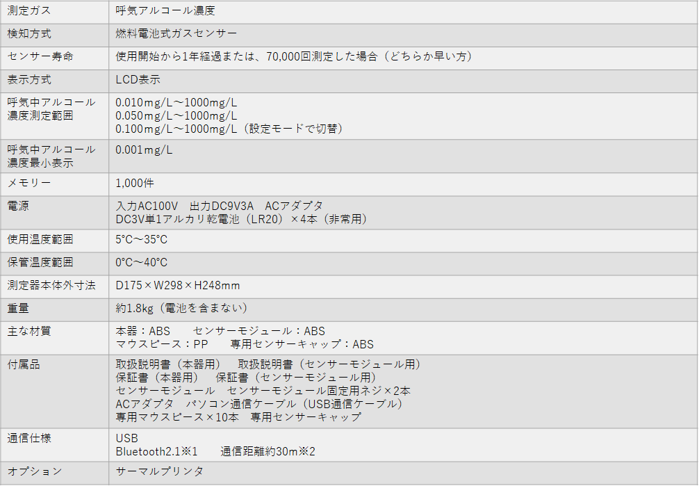 呼気のアルコール濃度を測定し測定記録をプリントできる、業務用呼気アルコール測定器です。