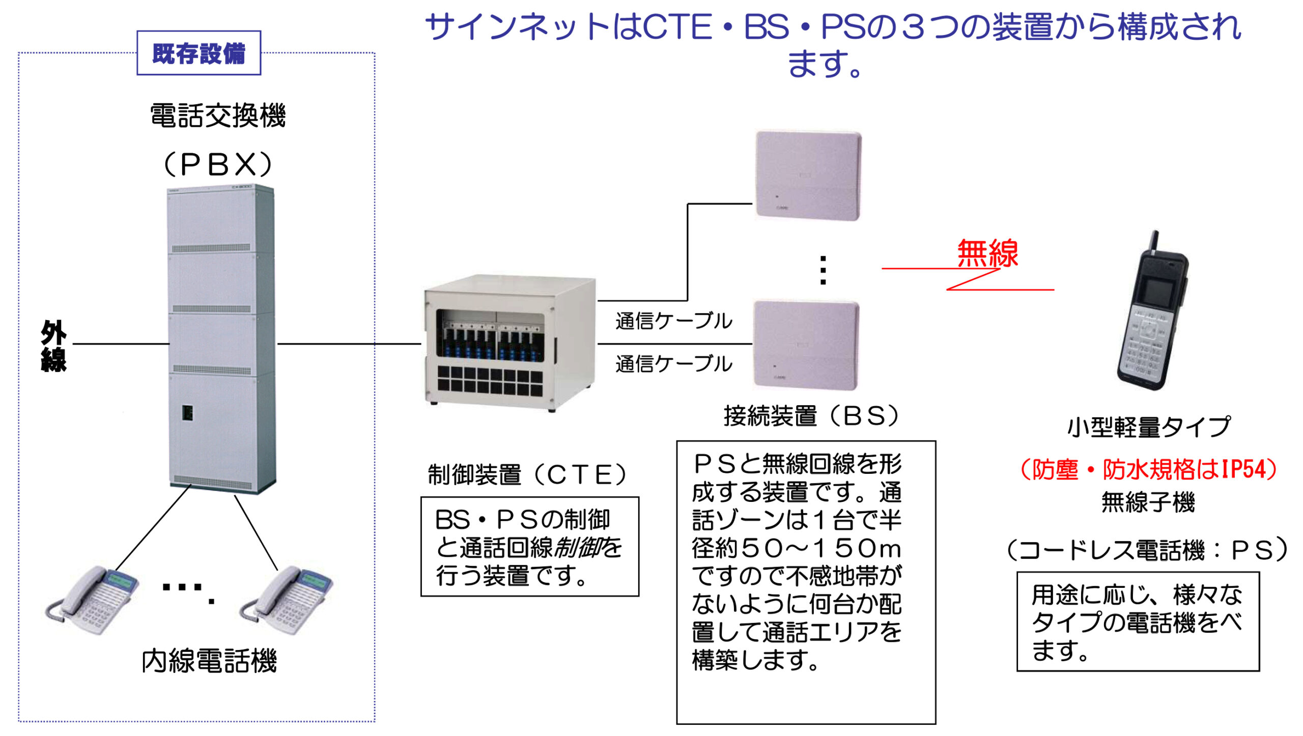 「サインネット」はPHSの技術を用いた、構内専用デジタルコードレスシステムです。