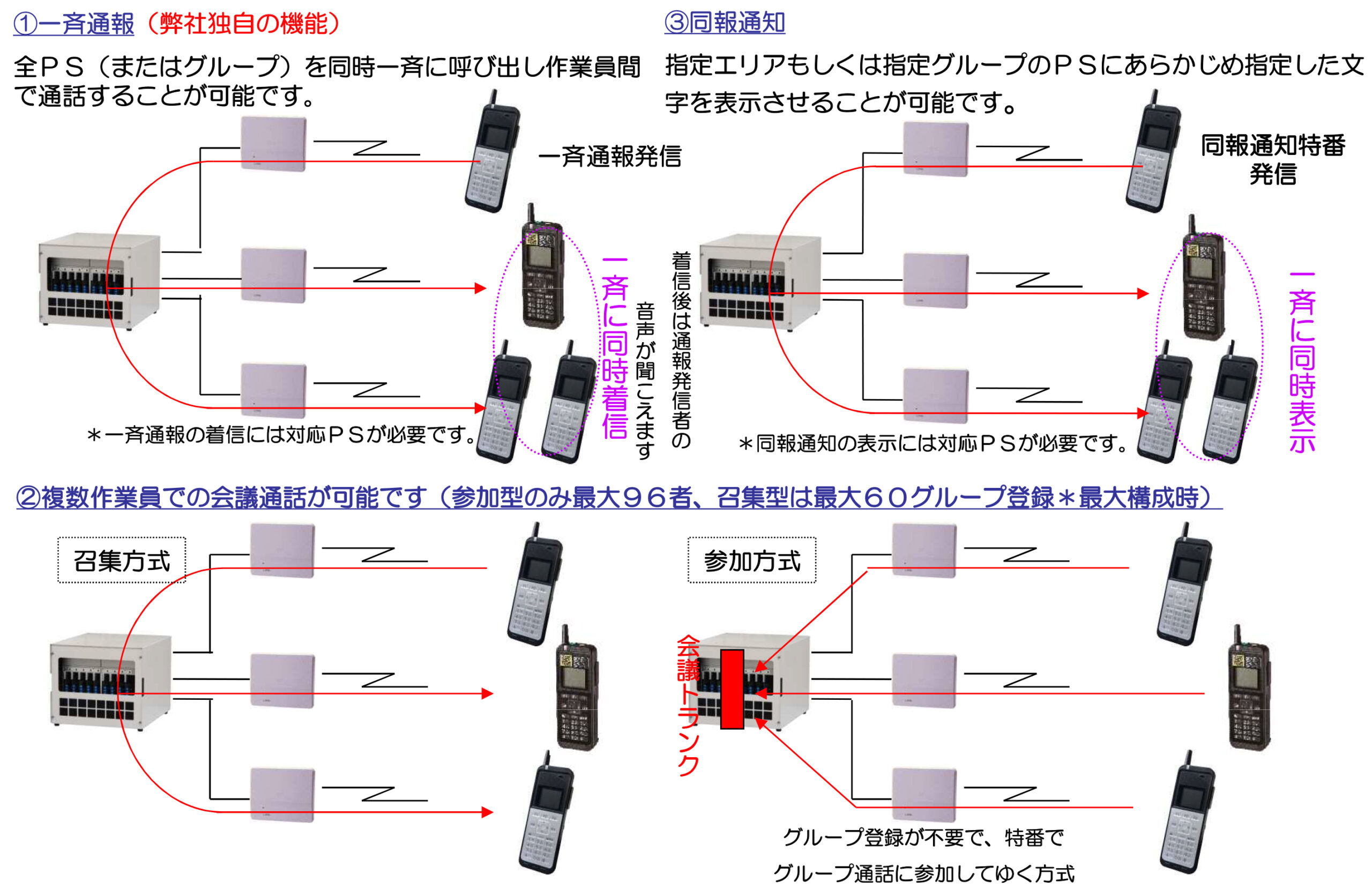 トランシーバーの様に一斉に他の携帯機へ指示・命令を行う事ができ、更に通話中の携帯機にも自動で音声が割り込み指示・命令を行う事が可能です。