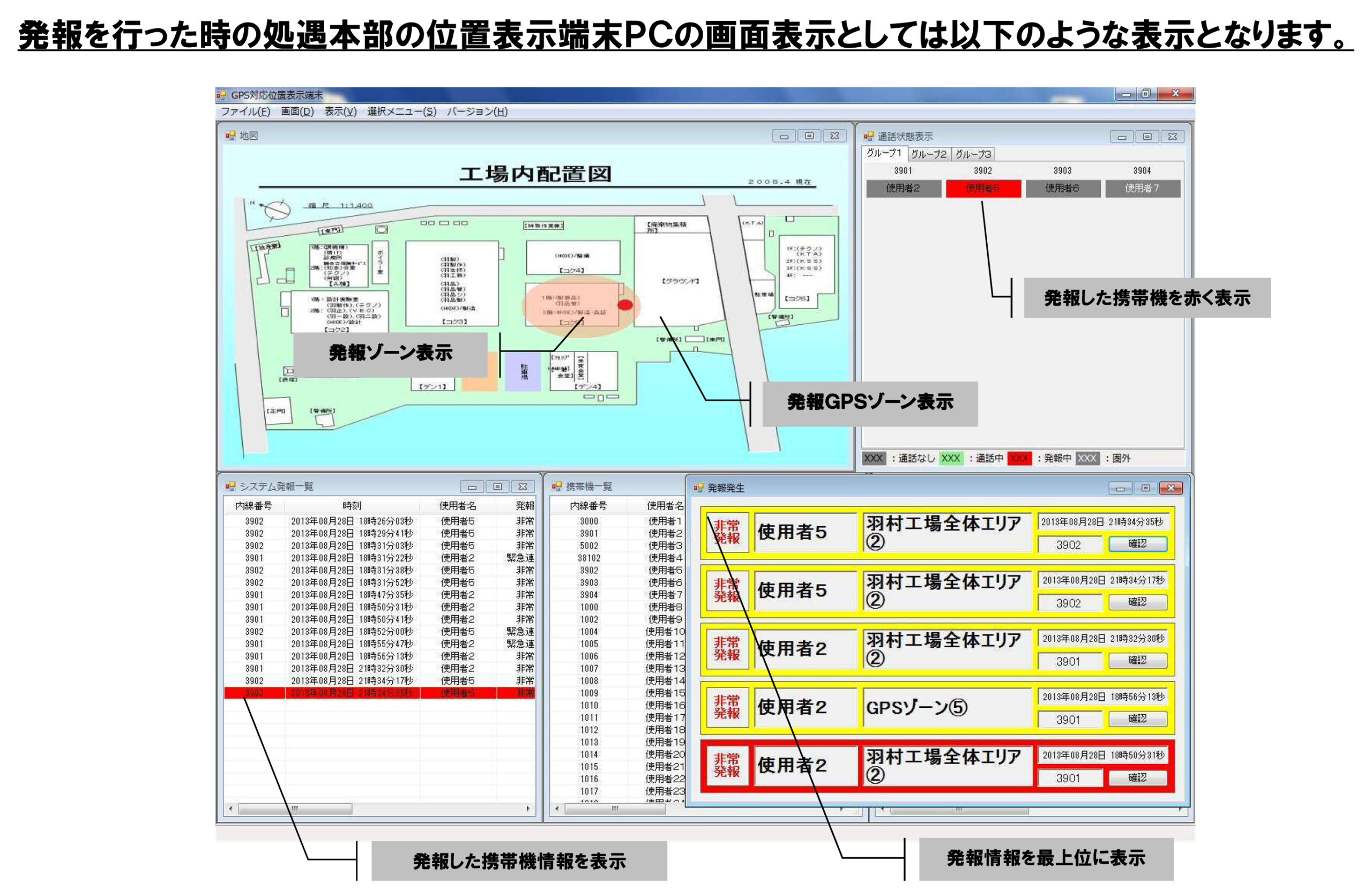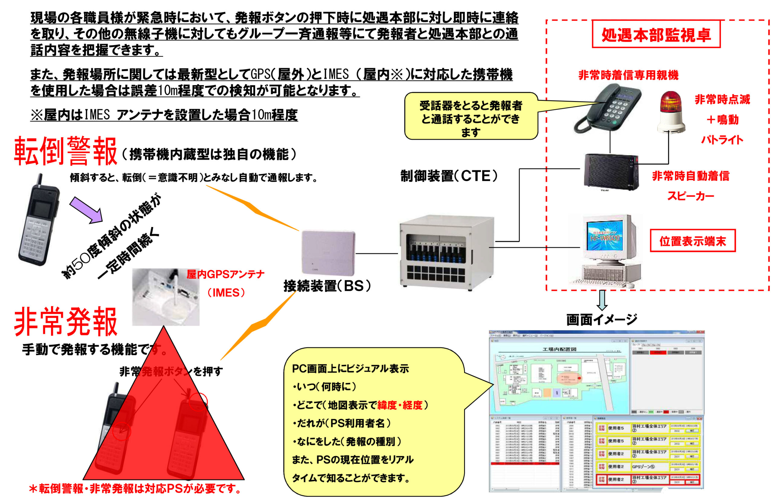 位置検知システムと連携することで、携帯機の非常ボタンを押下時や職員転倒時(自動)に携帯機がどこで発報したかがモニター表示や音声で瞬時に分かり、緊急時において即時性の高いシステムとなりえます。
