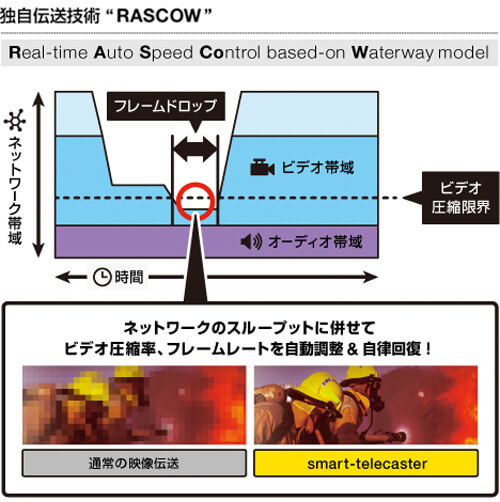 ソリトン独自のRASCOW(Real-time Auto Speed Control based-on Waterway model)テクノロジーにより、揺らぎの大きい環境においても継続して安定した映像伝送を行うことが可能です。